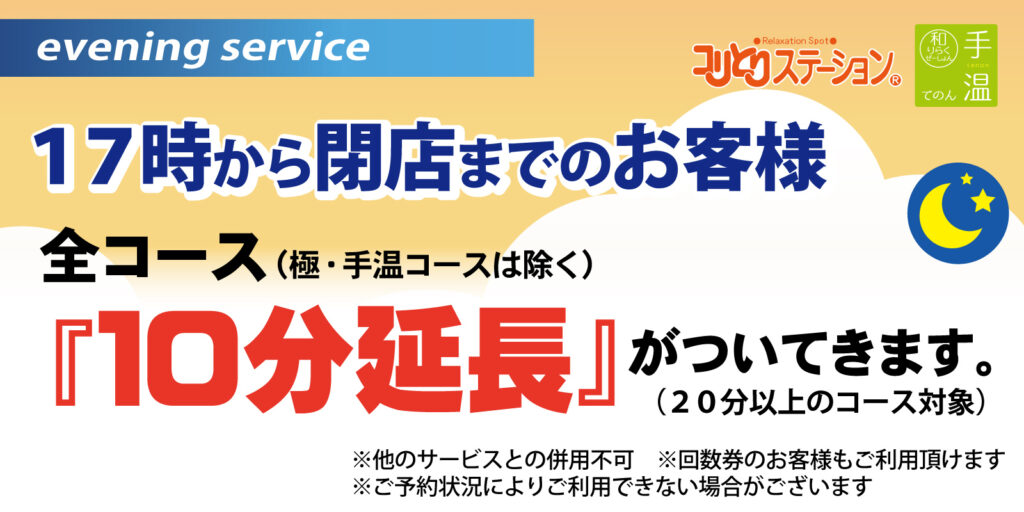 「 もう少しだけ癒されたい…」そんな気持ちに応える、ちょっと嬉しいイブニングサービス。お仕事帰りや一日の終わりに、心と体をほぐす贅沢なひとときをぜひご体感ください。